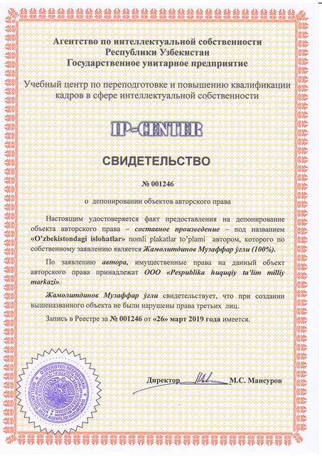 | 8942 | №001246 | Составное произведение - "O'zbekistondagi islohatlar" nomli plakatlar to'plami | Жвмолитдинов Музаффар Абдурахмон ўғли (100%) | ООО "Respublika huquqiy ta'lim milliy markazi" | 03/26/2019 | ![]() |