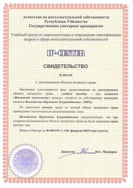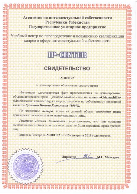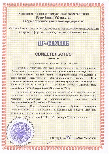 | 8998 | №001190 | Учебно-методический комплекс по курсам - "Рынок ценных бумаг и корпоративное управление в акционерных обществах» и «Организационные основы ЕПТК и совершенствование системы корпоративного управления в акционерных обществах" | Бутиков Игор Леонидович (50%), Ашуров Зуфар Абдуллоевич (50%) | Центр исследований проблем приватизации, развития конкуренции и корпоративного управления при Госкомконкуренции Республики Узбекистан | 01.07.2019 | ![]() |