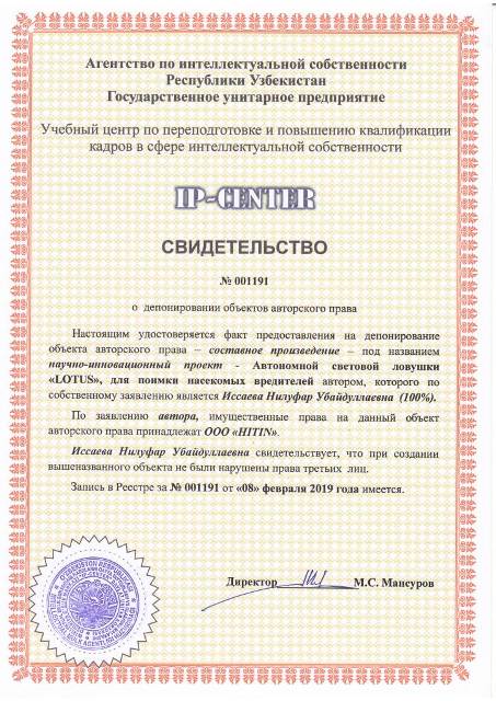 | 8997 | №001191 | Составное произведение - научно-инновационный проект- Автономной световой ловушки "LOTUS", для поимки насекомых вредителей | Иссаева Нилуфар Убайдуллаевна (100%) | ООО "HITIN" | 02.08.2019 | ![]() |