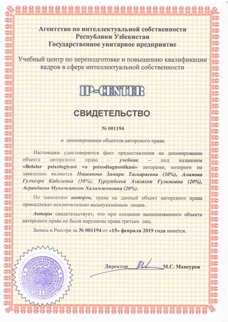 | 8994 | №001194 | Учебник - "Bolalar psixologiyasi va psixodiagnostikasi" | Нишанова Замира Таскараевна (30%), Алимова Гулчехра Кабелевна (30%), Тургунбаева Азизахон Ғуломовна (20%), Асранбаева Муножатхон Халимжоновна (20%) | Нишанова Замира Таскараевна, Алимова Гулчехра Кабелевна, Тургунбаева Азизахон Ғуломовна, Асранбаева Муножатхон Халимжоновна | 02/15/2019 | ![]() |