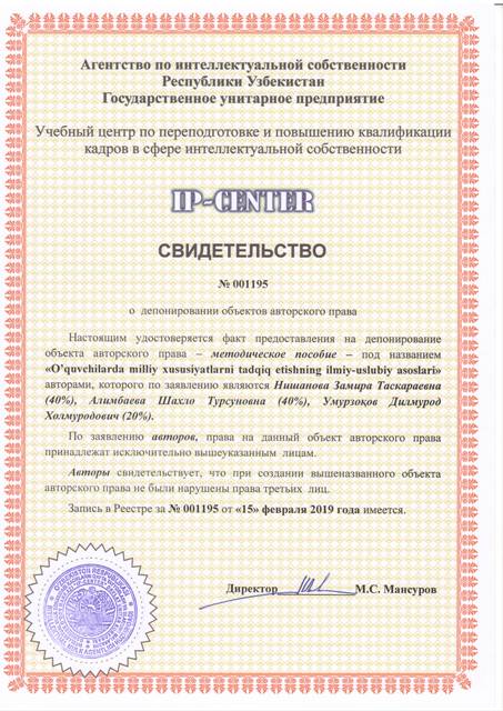 | 8993 | №001195 | Методическое пособие - "O'quvchilarda milliy xususiyatlarni tadqiq etishning ilmiy-uslubiy asoslari" | Нишанова Замира Таскараевна (40%), Алимбаевна Шахло Турсуновна (40%), Умурзоқов Дилмурод Холмуродович (20%) | Нишанова Замира Таскараевна, Алимбаевна Шахло Турсуновна, Умурзоқов Дилмурод Холмуродович | 02/15/2019 | ![]() |