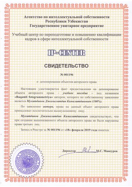 | 8992 | №001196 | Учебное пособие - "Raqamli fotogrammetriya" | Мухитдинов Джамалитдин Камалитдинович (100%) | Мухитдинов Джамалитдин Камалитдинович | 02/18/2019 | ![]() |