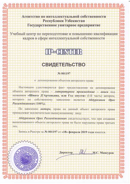 | 8991 | №001197 | Литературное произведение - книга - "Шпага Д'артаньяна, или Год спустья" (I-II-часть) | Абдуразаков Ораз Рахимджанович (100%) | Абдуразаков Ораз Рахимджанович | 02/18/2019 | ![]() |