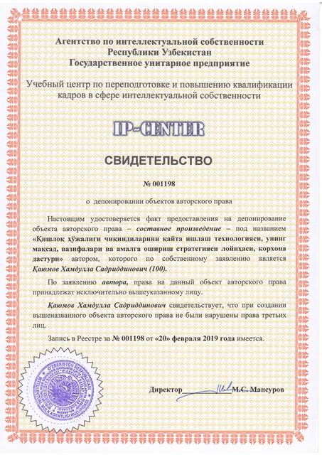 | 8990 | №001198 | Составное произведение - "Қишлоқ ҳўжалиги чиқиндиларини қайта ишлаш технологияси, унинг мақсад, вазифалари ва амалга ошириш стратегияси лойиҳаси, корхона дастури" кўргазмали тўплами | Қаюмов Хамдулла Садриддинович (100%) | Қаюмов Хамдулла Садриддинович | 02/20/2019 | ![]() |