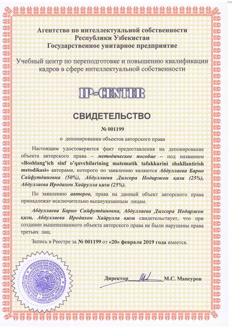 | 8989 | №001199 | Методическое пособие - "Boshlang'ich sinf o'quvchilarining matematik tafakkurini shakllantirish metodikasi" | Абдуллаева Барно Сайфутдиновна (50%), Абдуллаева Дилсора Нодиржон қизи (25%), Абдуллаева Иродахон Хайрулла қизи (25%) | Абдуллаева Барно Сайфутдиновна, Абдуллаева Дилсора Нодиржон, Абдуллаева Иродахон Хайрулла қизи | 02/20/2019 | ![]() |