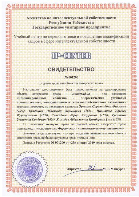 | 8988 | №001200 | Монография - "Комбинированные солнечно-энергетические установки промышленного, коммунального и сельскохозяйственного назначения" | Эргашев Сирожиддин Фаязович (20%), Қўлдашев Оббозжон Хокимович (16%), Нигматов Улугбек Журакузиевич (16%), Тожибоев Аброр Қахорович (16%), Рустамов Умиджон Соибович (16%), Хомидов Абдуллажон Қамбарали ўғли (16%) | Ферганский политехнический институт | 01/23/2019 | ![]() |