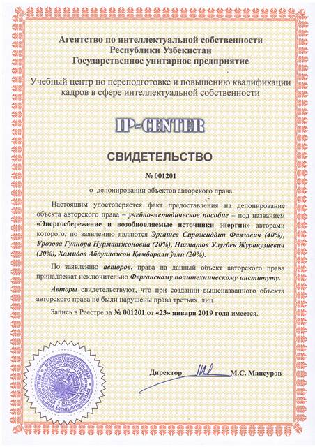 | 8987 | №001201 | Учебно-методическое пособие - "Энергосбережение и возобновляемые источники энергии" | Эргашев Сирожиддин Фаязович (40%), Урозова Гулнора Нурматжоновна (20%), Нигматов Улугбек Журакузиевич (20%), Хомидов Абдуллажон Қамбарали ўғли (20%) | Ферганский политехнический институт | 01/23/2019 | ![]() |