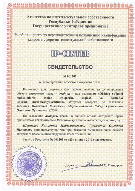 | 8986 | №001202 | Учебник - "Qishloq xo'jaligi mahsulotlarini ishlab chiqarish, saqlash va dastlabki ishlashni mexanizasiyalashtirish" | Шодмонов Хомиджон Мирзаахмадович (50%), Сулаймонов Омонжон Нумонович (50%) | Ферганский политехнический институт | 01/23/2019 | ![]() |