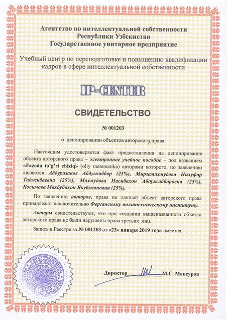 | 8985 | №001203 | Электронное-учебное пособие - "Fazoda to'g'ri chiziq" (oliy matematika) | Абдуразаков Абдужаббор (25%), Мирзамахмудова Нилуфар Таджибаевна (25%), Махмудова Насибахон Абдужабборовна (25%), Қосимова Махбубахон Якубжоновна (25%) | Ферганский политехнический институт | 01/23/2019 | ![]() |