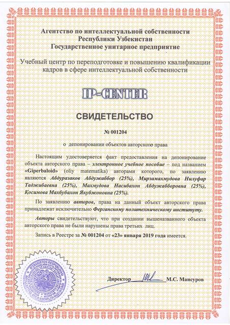 | 8984 | №001204 | Электронное-учебное пособие - "Giperbaloid" (oliy matematika) | Абдуразаков Абдужаббор (25%), Мирзамахмудова Нилуфар Таджибаевна (25%), Махмудова Насибахон Абдужабборовна (25%), Қосимова Махбубахон Якубжоновна (25%) | Ферганский политехнический институт | 01/23/2019 | ![]() |