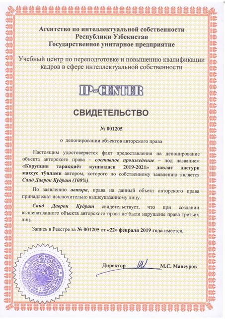 | 8983 | №001205 | Составное произведение - "Корупция тараққиёт кушандаси 2019-2021" давлат дастури махсус тўплами | Саид Даврон Қудрат (100%) | Саид Даврон Қудрат | 02/22/2019 | ![]() |