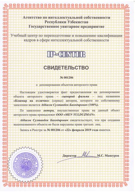 | 8982 | №001206 | Сценарий фильма - "Кошмар на отлично" (сериал) | Аббасов Султанбек Баходирович (100%) | ООО "MEN YULDUZMAN" | 02/22/2019 | ![]() |