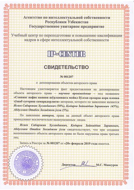 | 8981 | №001207 | Научное произведение - "Соянинг нафис навини шўрланишга мойил бўлган ерларда қора пленка тўшаб суғориш самарадорлиги" | Исаев Сабиржан Хусанбаевич (50%), Қодиров Зайниддин Зарипович (45%), Абдуллаев Отабек Зохиджон ўғли (5%) | Исаев Сабиржан Хусанбаевич, Қодиров Зайниддин Зарипович, Абдуллаев Отабек Зохиджон ўғли | 02/20/2019 | ![]() |