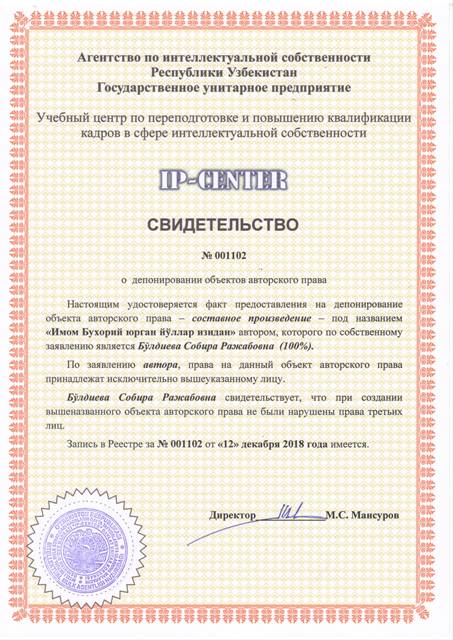 | 9059 | №001102 | Составное произведение - "Имом Бухорий юрган йўллар изидан" | Бўлдиева Собира Ражабовна (100%) | Бўлдиева Собира Ражабовна | 12/12/2018 | ![]() |