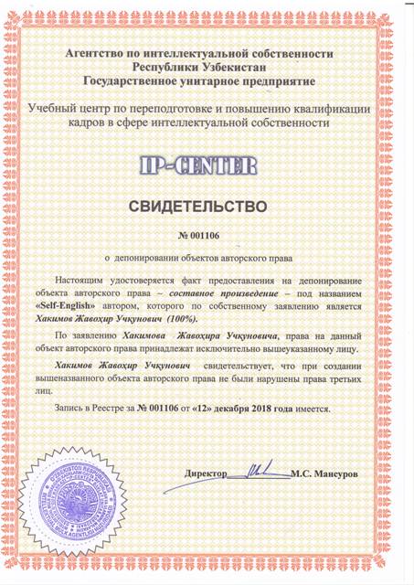 | 9055 | №001106 | Составное произведение - "Self-English" | Хакимов Жавоҳир Учқунович (100%) | Хакимов Жавоҳир Учқунович | 12/12/2018 | ![]() |