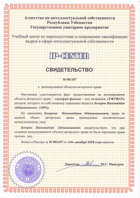 | 9054 | №001107 | Сценарий фильма - "УФУНАТ" | Бозоров Низомиддин Абдихакимович (100%) | Бозоров Низомиддин Абдихакимович | 12/14/2018 | ![]() |