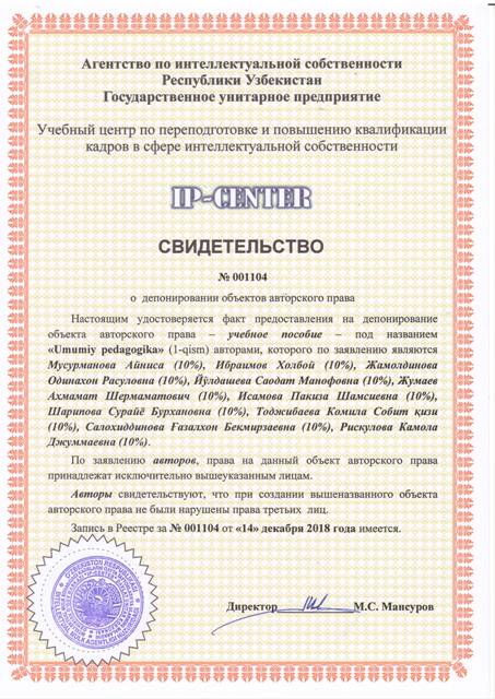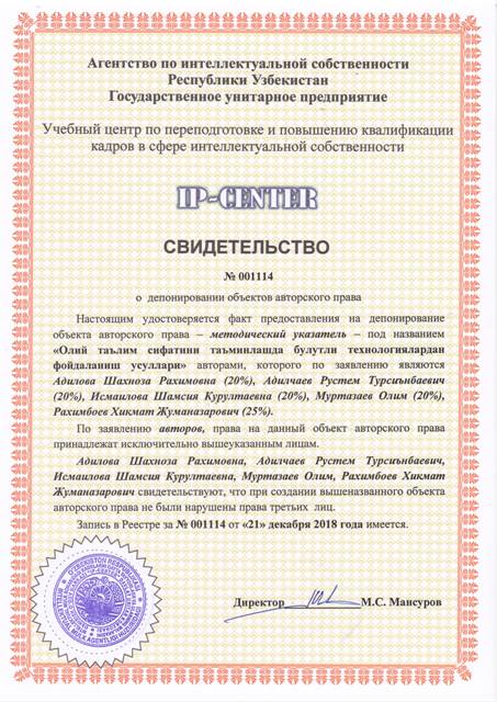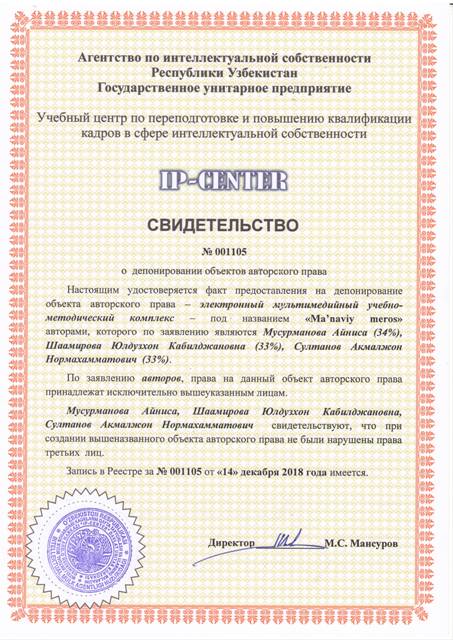 | 9056 | №001105 | Электронный мультимедийный учебно - методический комплекс - "Ma'naviy meros " | Мусурманова Айниса (34%), Шаамирова Юлдузхон Камилджановна (33%), Султанов Акмалжон Нормахамматович (33%) | Мусурманова Айниса (34%), Шаамирова Юлдузхон Камилджановна (33%), Султанов Акмалжон Нормахамматович (33%) | 12/14/2018 | ![]() |