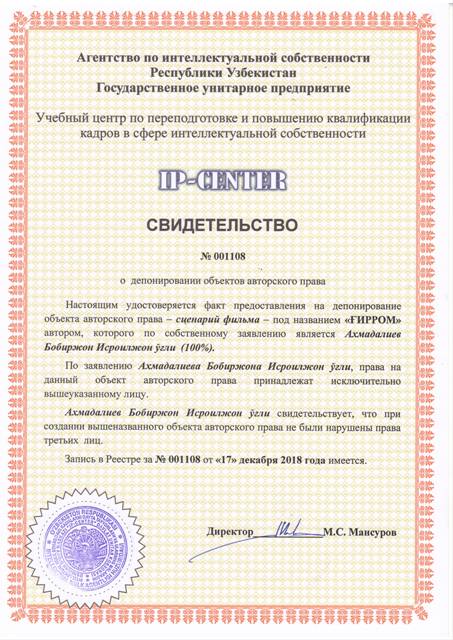 | 9053 | №001108 | Сценарий фильма - "ҒИРРОМ" | Ахмадалиев Бобуржон Исроилжон ўғли (100%) | Ахмадалиев Бобуржон Исроилжон ўғли | 12/17/2018 | ![]() |