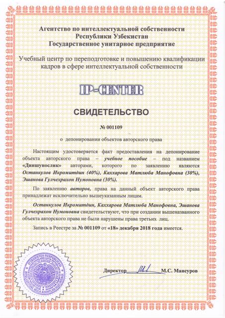 | 9052 | №001109 | Учебное пособие - "Диншунослик" | Останкулов Икромитдин (40%), Каххарова Матлюба Манофовна (30%), Эшанова Гулчехрахон Нумоновна (30%) | Останкулов Икромитдин, Каххарова Матлюба Манофовна, Эшанова Гулчехрахон Нумоновна | 12/18/2018 | ![]() |