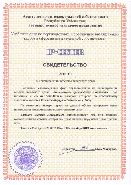 | 9051 | №001110 | Музыкальное произведение с текстом - "Eclair Soundrack" | Камалов Фаррух Юлдашевич (100%) | Камалов Фаррух Юлдашевич | 12/19/2018 | ![]() |