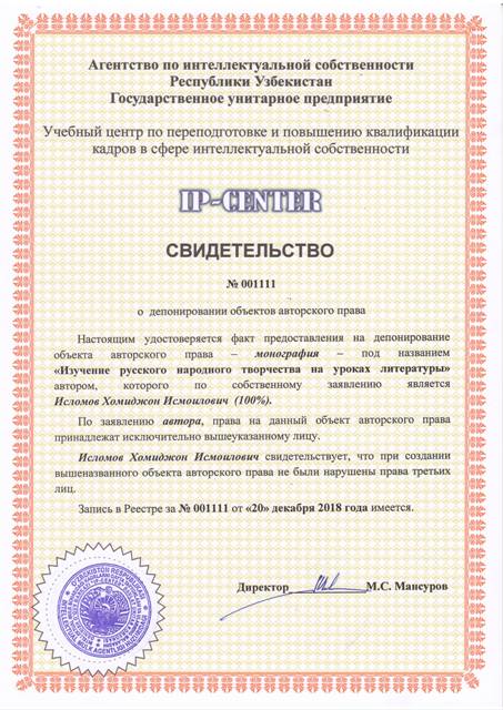 | 9050 | №001111 | Монография - "Изучение русского народного творчества на уроках литературы" | Исломов Хомиджон Исмоилович (100%) | Исломов Хомиджон Исмоилович | 12/20/2018 | ![]() |