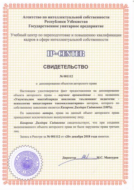 | 9049 | №001112 | Научное произведение - "Умумтаълим мактабларида инклюзив таълимнинг педагогик-психологик жиҳатларини такомиллаштириш" | Кахарова Дилдора Сидиковна (100%) | Кахарова Дилдора Сидиковна | 12/20/2018 | ![]() |