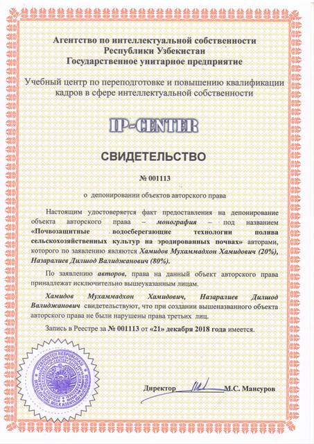 | 9048 | №001113 | Монография - "Почвозащитные водосберегающие технологии полива сельскохозяйственных культур на эродированных почвах" | Хамидов Мухаммадхон Хамидович (20%), Назаралиев Дилшод Валиджанович (80%) | Хамидов Мухаммадхон Хамидович, Назаралиев Дилшод Валиджанович | 12/21/2018 | ![]() |
