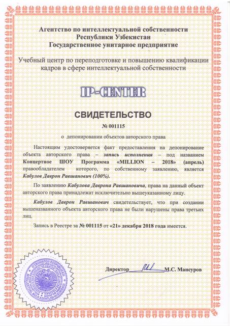 | 9046 | №001115 | Запись испольнения-Концертное ШОУ Программа "MILLION - 2018" (апрель) | Кабулов Даврон Равшанович (100%) | Кабулов Даврон Равшанович | 12/21/2018 | ![]() |