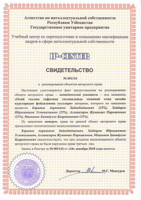 | 9045 | №001116 | Методическое указатель - "Олий таълим сифатини таъминлашда оммавий очиқ онлайн курсларидан фойдаланиш усуллари" | Каримов Акрамжон Зайнобидинович (25%), Хайдаров Иброхимжон Усмоналиевич (25%), Алланазаров Жуманияз Пирниязович (25%), Маҳкамов Ҳамидулло Қахрамонович (25%) | Каримов Акрамжон Зайнобидинович, Хайдаров Иброхимжон Усмоналиевич, Алланазаров Жуманияз Пирниязович, Маҳкамов Ҳамидулло Қахрамонович | 12/24/2018 | ![]() |