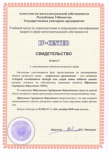 | 9044 | №001117 | Графическое изображение - "Chiqindi avtoshinalarni ekologik toza yoqish uchun utilizator qozoni" | Иброхимов Cардоржон Фарходович (100%) | Иброхимов Cардоржон Фарходович | 12/24/2018 | ![]() |
