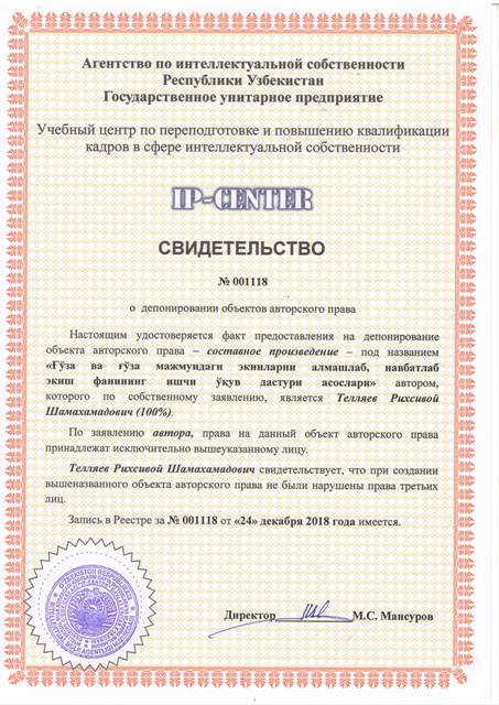 | 9043 | №001118 | Составное произведение - "Ғўза ва ғўза мажмуидаги экинларни алмашлаб, навбатлаб экиш фанининг ишчи ўқув дастури асослари" | Телляев Рихсивой Шамахамадович (100%) | Телляев Рихсивой Шамахамадович | 12/24/2018 | ![]() |