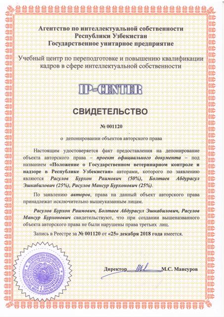 | 9041 | №001120 | Проект официального документа - "Положение о Государственном ветеринарном контроле и надзоре в Республике Узбекистан" | Расулов Бурхон Раимович (50%), Болтаев Абдурасул Эшкабилович (25%), Расулов Мансур Бурхонович (50%) | Расулов Бурхон Раимович, Болтаев Абдурасул Эшкабилович, Расулов Мансур Бурхонович | 12/25/2018 | ![]() |
