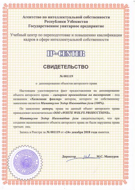 | 9042 | №001119 | Сценарное произведение на телепроект - "Хазилкаш фанлар" | Маматқулов Элдор Низомиддин ўғли (100%) | OOO "WHITE WOLFS PRODUCTIONS" | 12/24/2018 | ![]() |