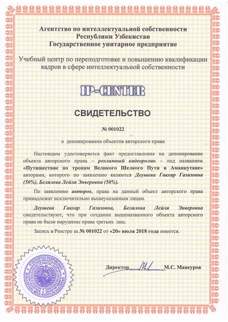 | 9139 | №001022 | Рекламный видеоролик - "Путиществие по тропам Великого Шелкого Пути в Аманкутане" | Деушева Гаухар Газизовна (50%), Белялова Лейля Энверовна (50%) | Деушева Гаухар Газизовна, Белялова Лейля Энверовна | 07/20/2018 | ![]() |