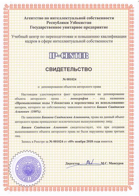 | 9137 | №001024 | Монография - "Промышленные воды Узбекистана и перспективы их использования" | Бакиев Саиднасим Алимович (100%) | Бакиев Саиднасим Алимович | 11/09/2018 | ![]() |