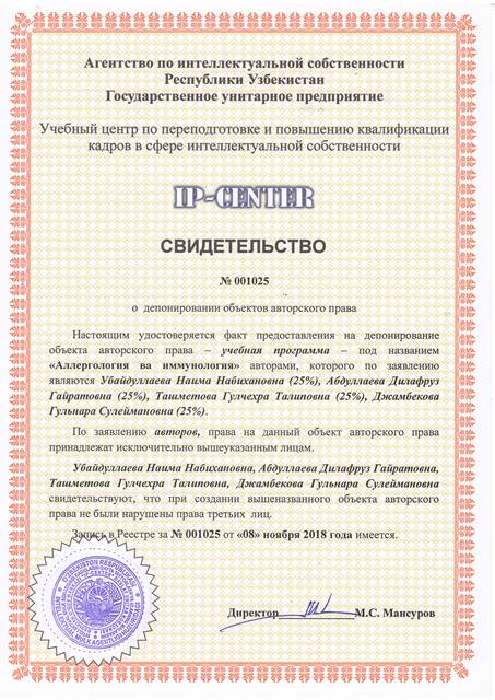 | 9136 | №001025 | Учебная программа - "Аллергология ва иммунология" | Убайдуллаева Наима набихановна (25%), Абдуллаева Дилафруз Гайратовна (25%), Ташметова Гулчехра Талиповна (25%), Джамбекова Гульнара Сулеймановна (25%) | Убайдуллаева Наима набихановна, Абдуллаева Дилафруз Гайратовна, Ташметова Гулчехра Талиповна, Джамбекова Гульнара Сулеймановна | 11/08/2018 | ![]() |