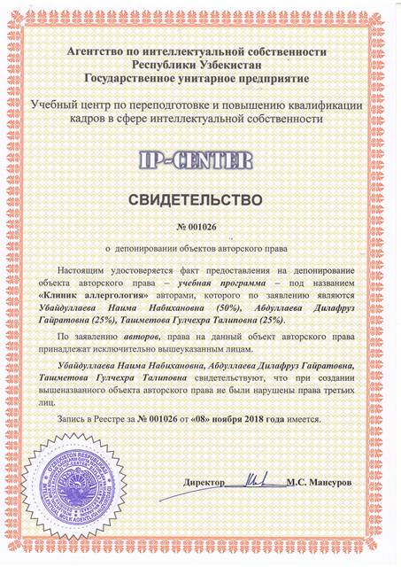 | 9135 | №001026 | Учебная программа - "Клиник аллергология" | Убайдуллаева Наима набихановна (50%), Абдуллаева Дилафруз Гайратовна (25%), Ташметова Гулчехра Талиповна (25%) | Убайдуллаева Наима набихановна, Абдуллаева Дилафруз Гайратовна, Ташметова Гулчехра Талиповна | 11/08/2018 | ![]() |