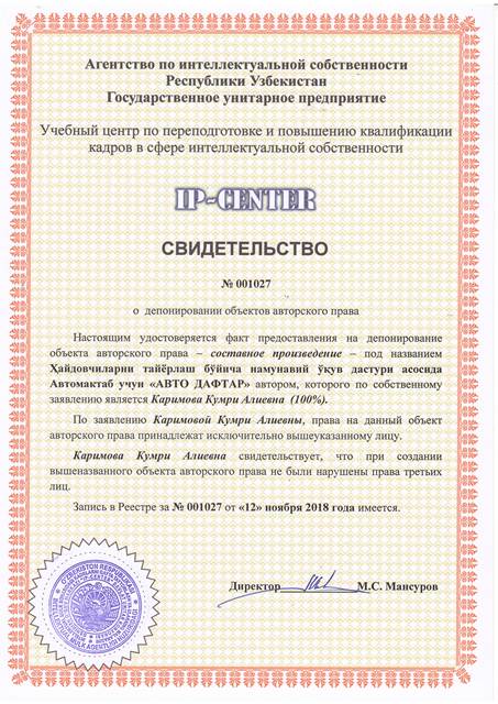 | 9134 | №001027 | Составное произведение - Ҳайдовчиларни тайёрлаш бўйича намунавий ўқув дастури асосида Автомактаб учун "АВТО ДАФТАР" | Каримова Кумри Алиевна (100%) | Каримова Кумри Алиевна | 11/12/2018 | ![]() |