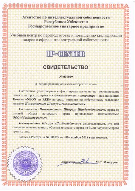 | 9132 | №001029 | Художественная литература - Комикс "NEON va RED" | Низамутдинов Шахрух Шахбозиддинович | ООО "Marketing partner" | 11/06/2018 | ![]() |