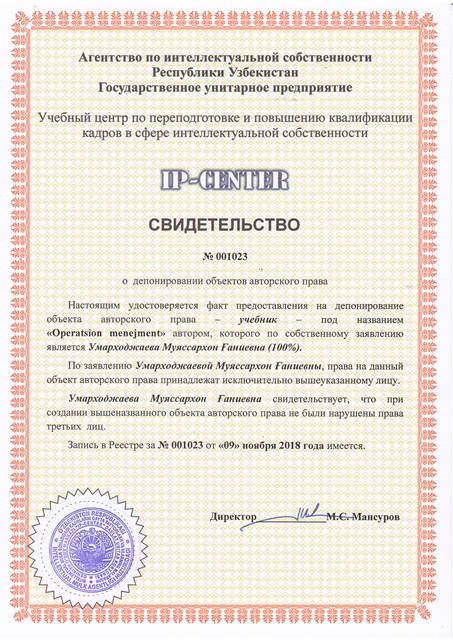 | 9138 | №001023 | Учебник - "Operatsion menejment" | Умарходжаева Муяссархон Ғаниевна (100%) | Умарходжаева Муяссархон Ғаниевна | 11/09/2018 | ![]() |