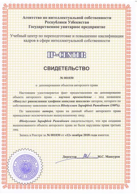 | 9131 | №001030 | Научное произведение - "Инсульт ривожланиш ҳавфини аниқлаш шкаласи" | Ибодуллаев Зарифбой Ражабович (100%) | Ибодуллаев Зарифбой Ражабович | 11/12/2018 | ![]() |