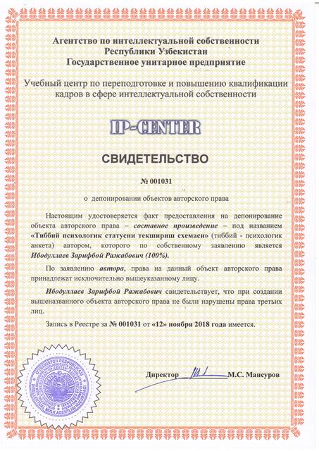 | 9130 | №001031 | Составное произведение - "Тиббий психологик статусни текшириш схемаси" (тиббий - психологик анкета) | Ибодуллаев Зарифбой Ражабович (100%) | Ибодуллаев Зарифбой Ражабович | 11/12/2018 | ![]() |