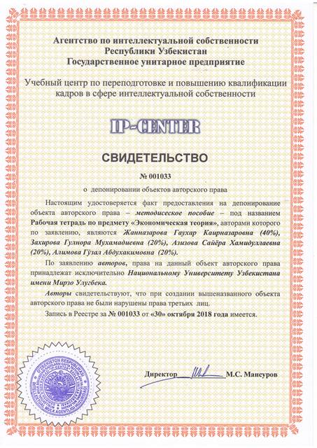 | 9128 | №001033 | Методическое пособие - Рабочая тетрадь по предмету "Экономическая теория" | Жанназарова Гаухар Каирназарова (40%), Захирова Гулнора Мухамадиевна (20%), Азизова Сайёра Хамидуллаевна (20%), Алимова Гўзал Абдухакимовна (20%) | Национальный Университет Узбекистана имени Мирзо Улугбека | 10/30/2018 | ![]() |