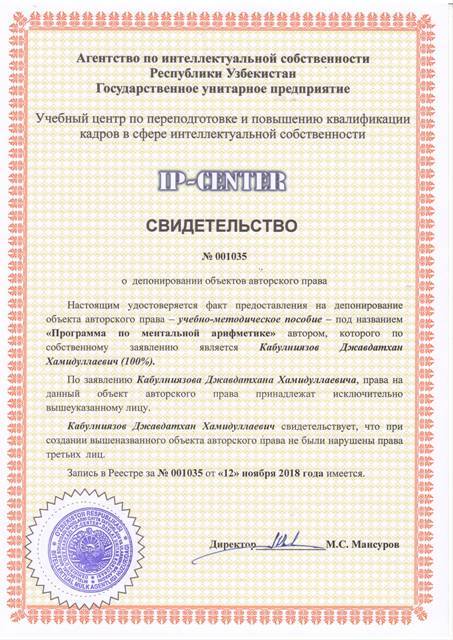 | 9126 | №001035 | Учебно-методическое пособие - "Программа по ментальной арифметике" | Кабулниязов Джавдатхан Хамидуллаевич (100%) | Кабулниязов Джавдатхан Хамидуллаевич | 11/12/2018 | ![]() |