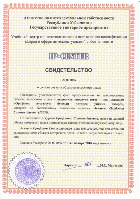 | 9125 | №001036 | Авторское описание игры - "Орифжон пул-ютуқ буюмли лоторея ўйини" | Асқаров Орифжон Сотволдиевич (100%) | Асқаров Орифжон Сотволдиевич | 11/14/2018 | ![]() |