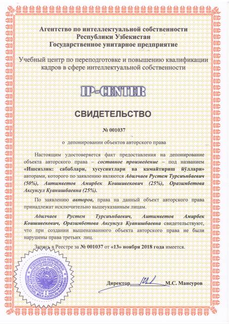 | 9124 | №001037 | Составное произведение - "Ишсизлик: сабаблари, хусусиятлари ва камайтириш йўллари" | Адилчаев Рустем Турсиънбаевич (50%), Аитимветов Амирбек Коишибекович (25%), Оразимбетова Аксунгул Куанишбаевна (25%) | Адилчаев Рустем Турсиънбаевич, Аитимветов Амирбек Коишибекович, Оразимбетова Аксунгул Куанишбаевна | 11/13/2018 | ![]() |