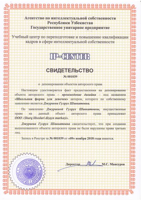 | 9122 | №001039 | Произведение дизайна - "Школьная форма для девочек" | Дураева Гулрух Шавкатовна (100%) | ООО "Sharq liboslari dizayn markazi" | 11/09/2018 | ![]() |