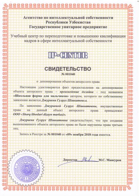 | 9121 | №001040 | Произведение дизайна - "Школьная форма для мальчиков" | Дураева Гулрух Шавкатовна (100%) | ООО "Sharq liboslari dizayn markazi" | 11/09/2018 | ![]() |