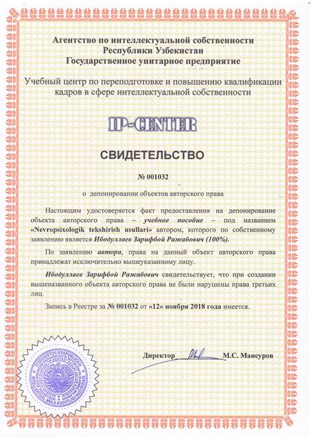 | 9129 | №001032 | Учебное пособие - "Nevropsixologik tekshirish usullari" | Ибодуллаев Зарифбой Ражабович (100%) | Ибодуллаев Зарифбой Ражабович | 11/12/2018 | ![]() |