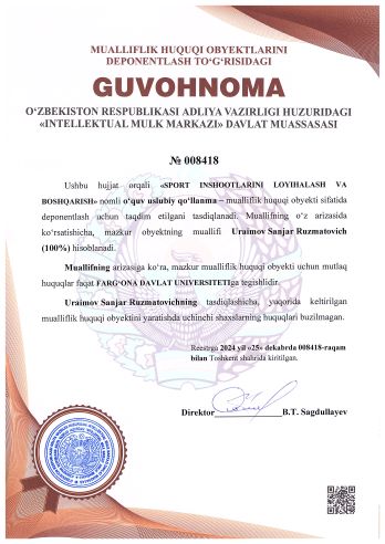 919 | №008418 | O’quv-uslubiy qo‘llanma– "SPORT INSHOOTLARINI LOYIHALASH VA BOSHQARISH" | Uraimov Sanjar Ruzmatovich (100%) | FARG‘ONA DAVLAT UNIVERSITETI | 12/25/2024 | ![]() |
